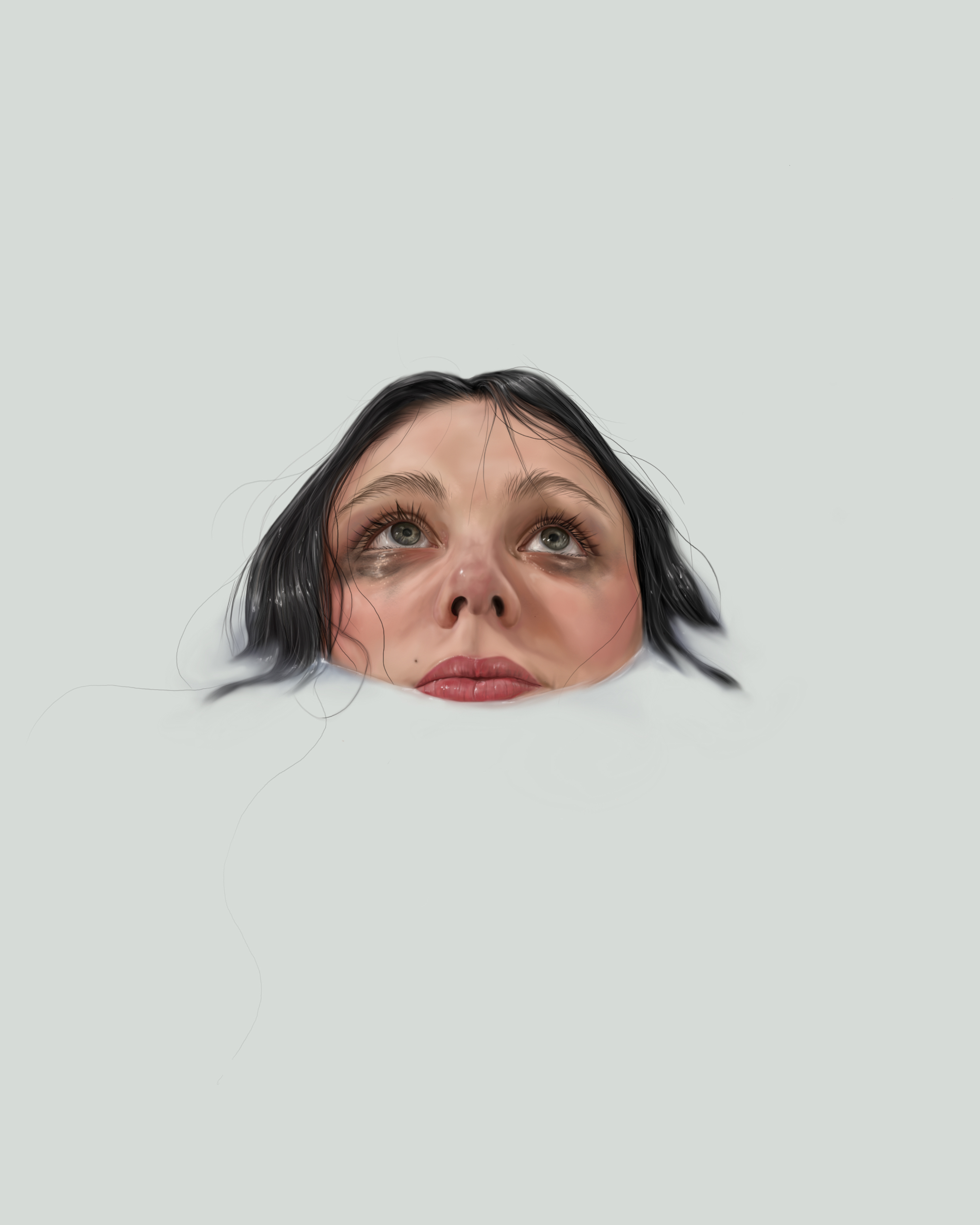 Her portraits are studies in suspension. Solitary figures float in vast, empty space — stripped of context, untethered from ground or sky. They exist in a state of in-between and ask you to stay with what's unresolved.